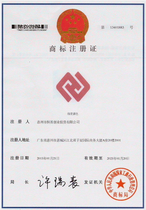 近日,广东恒创投资股份有限公司(前身惠州市恒基创投)的商标注册申请成功获批,这对于弘扬广东恒创的企业文化,提升快速贷互联网金融创新平台的品牌价值,加强公司的知识产权保护,都有着深远的意义;同时,也为公司在互联网金融领域的创新拓展提供了更坚实的后盾。